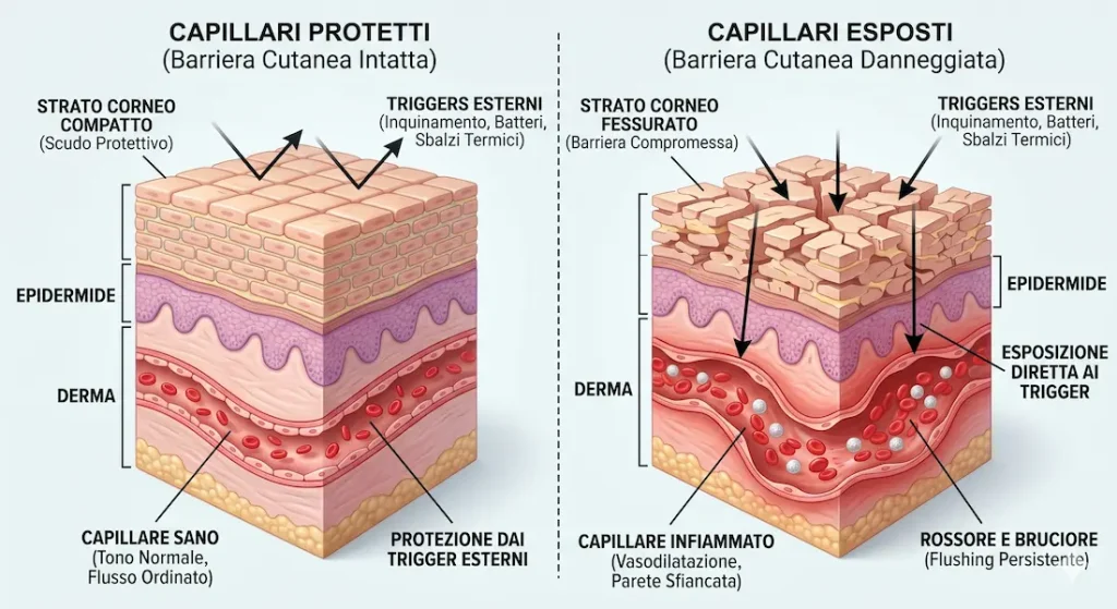 La barriera cutanea funge da isolante termico e chimico per i vasi sanguigni del derma. Quando questa barriera viene compromessa da una pulizia troppo aggressiva, i capillari rimangono “scoperti” e reagiscono bruscamente a ogni minimo sbalzo o contatto. Questa esposizione continua alimenta uno stato di vasodilatazione cronica che, nel tempo, porta alla comparsa di capillari visibili e a un incarnato permanentemente arrossato.